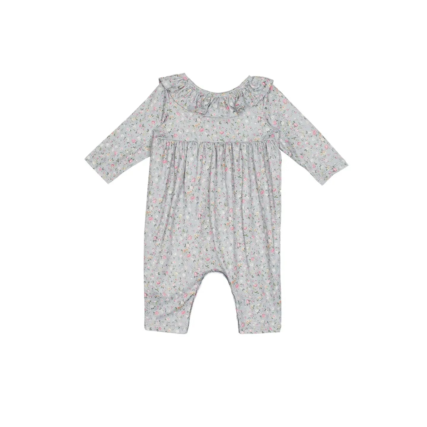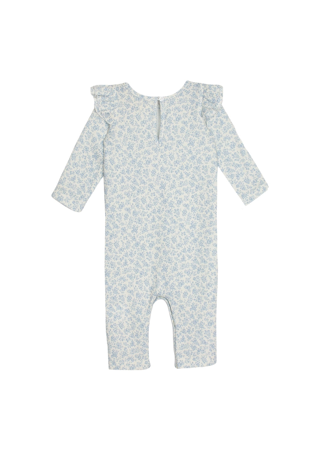 Dress your little one in the Hannah Romper, a charming ensemble featuring a dainty floral print on soft cotton fabric. This light blue romper is adorned with delicate ruffle accents at the shoulders, offering a sweet, vintage look. Perfect for comfortable play and nap times, it's a must-have for everyday cuteness. Fabric Care Machine Wash Cold | Line Dry Do Not Bleach