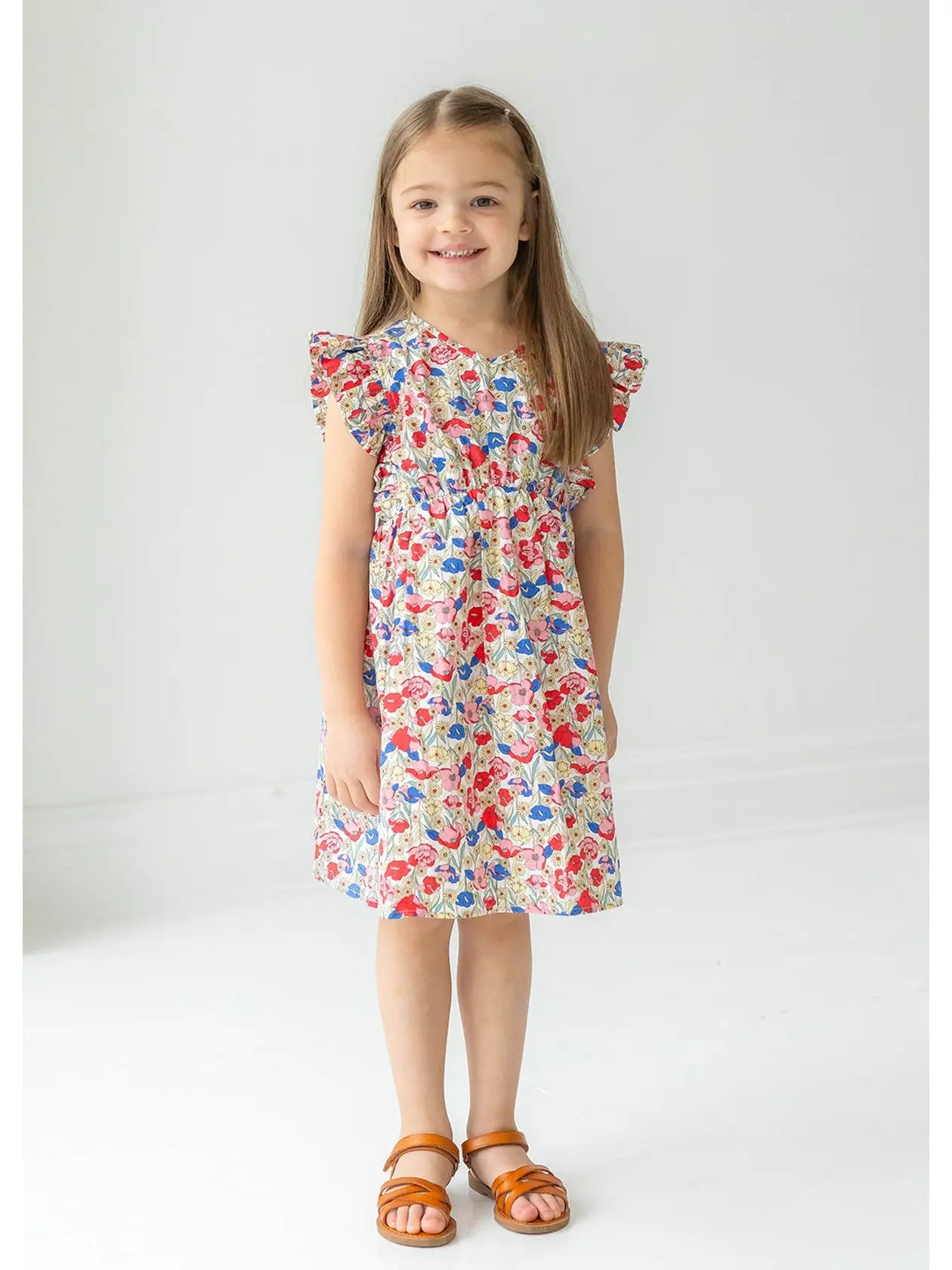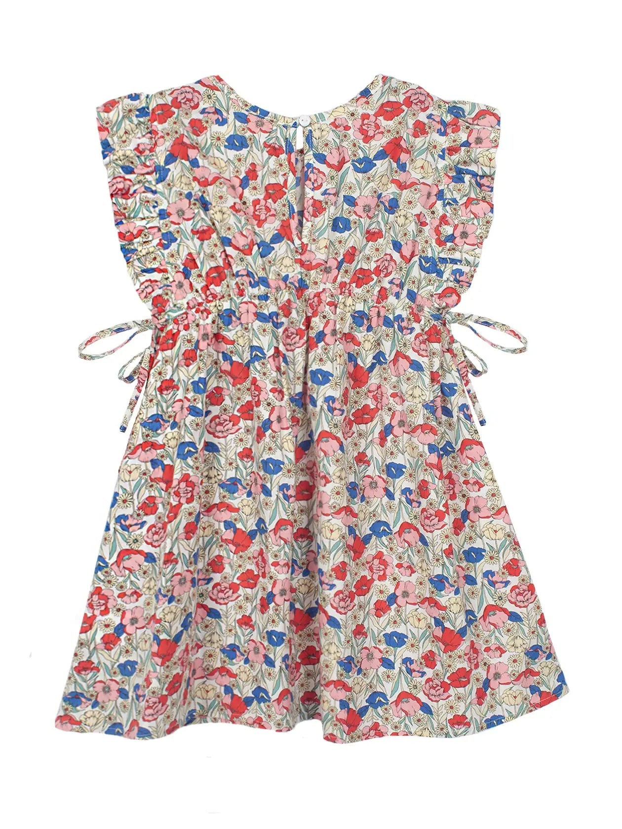 This charming girl's dress features a vibrant floral print in shades of red, blue, pink, and green on a cream background. The dress is designed with ruffled sleeves and side tie details for added style. It has a smocked bodice for a comfortable fit and a flowy skirt, perfect for both casual outings and special occasions. Fabric Care 100% COTTON Machine Wash Cold | Line Dry Do Not Bleach