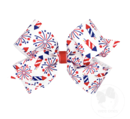 The perfect finishing touch for summer BBQs and fireworks! This Medium Grosgrain hairbow features an adorable patriotic flag print to compliment any red, white, and blue outfit.This bow is sure to stay in her hair all day with our patented WeeStay™ no-slip hair clip.